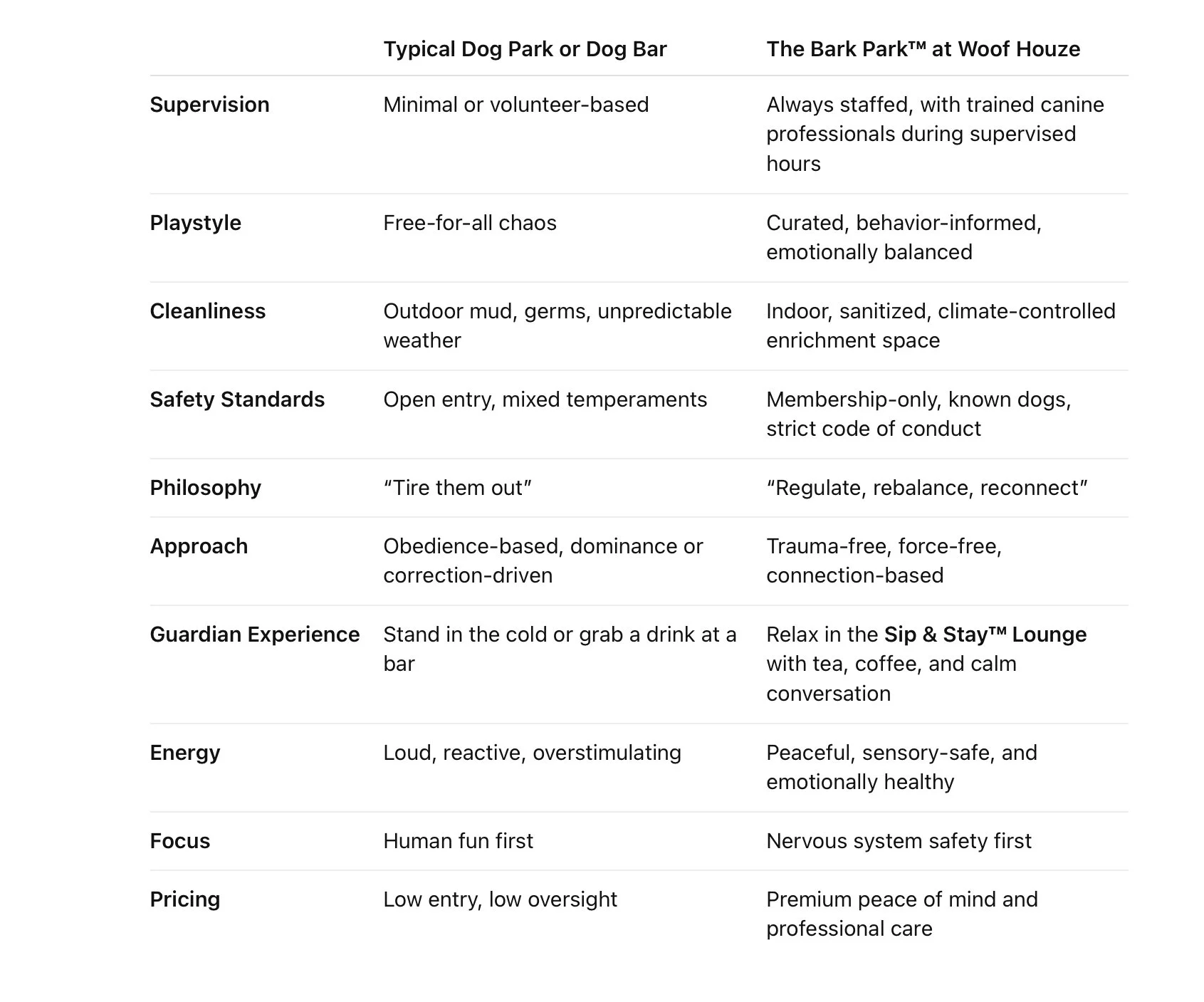 We built The Bark Park™ to protect dogs from overstimulation, chaos, and outdated “socialization” methods that often do more harm than good.
